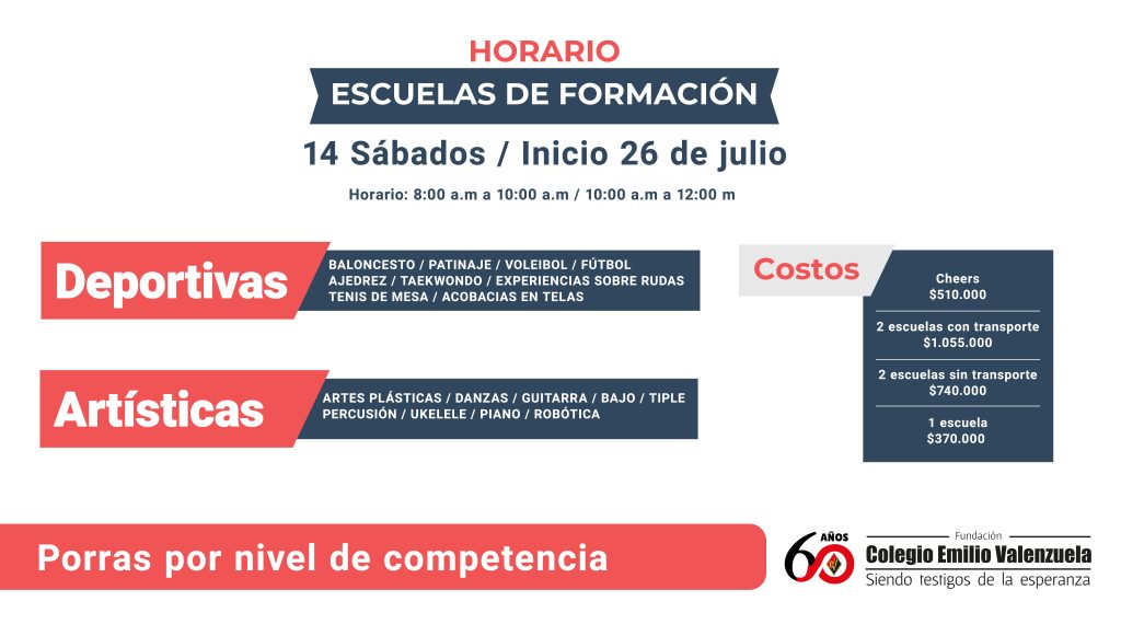 El arte, la danza, el teatro y la música hacen parte integral del proceso formativo en la FCEV, ya que, por medio de su programa académico brinda a los estudiantes la posibilidad de conocer un mundo imaginario, además, lo complementa de forma extracurricular, promoviendo espacios donde los niños y jóvenes desarrollan sus pasiones y habilidades que promueven la cooperación, colaboración, apoyo y respeto, ayudándolos a sentirse más cómodos con el otro, encontrando nuevos intereses, disfrutando el que ya conocen, ampliando su horizonte cultural, haciendo uso del tiempo libre y finalmente, los prepara para su inserción a la sociedad.